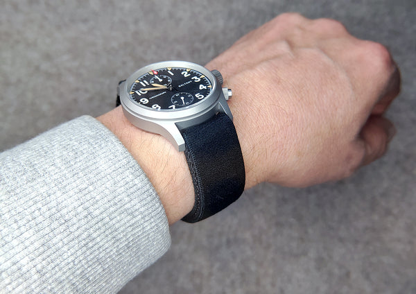 It's not easy to be innovative with watch strap design but they really pulled it off. The strap has no hardware and is made with a semi rigid underside against your wrist and an elastic part of the strap you pull over your hand to put on the watch. Swipe to the last pic to get an idea how it works.